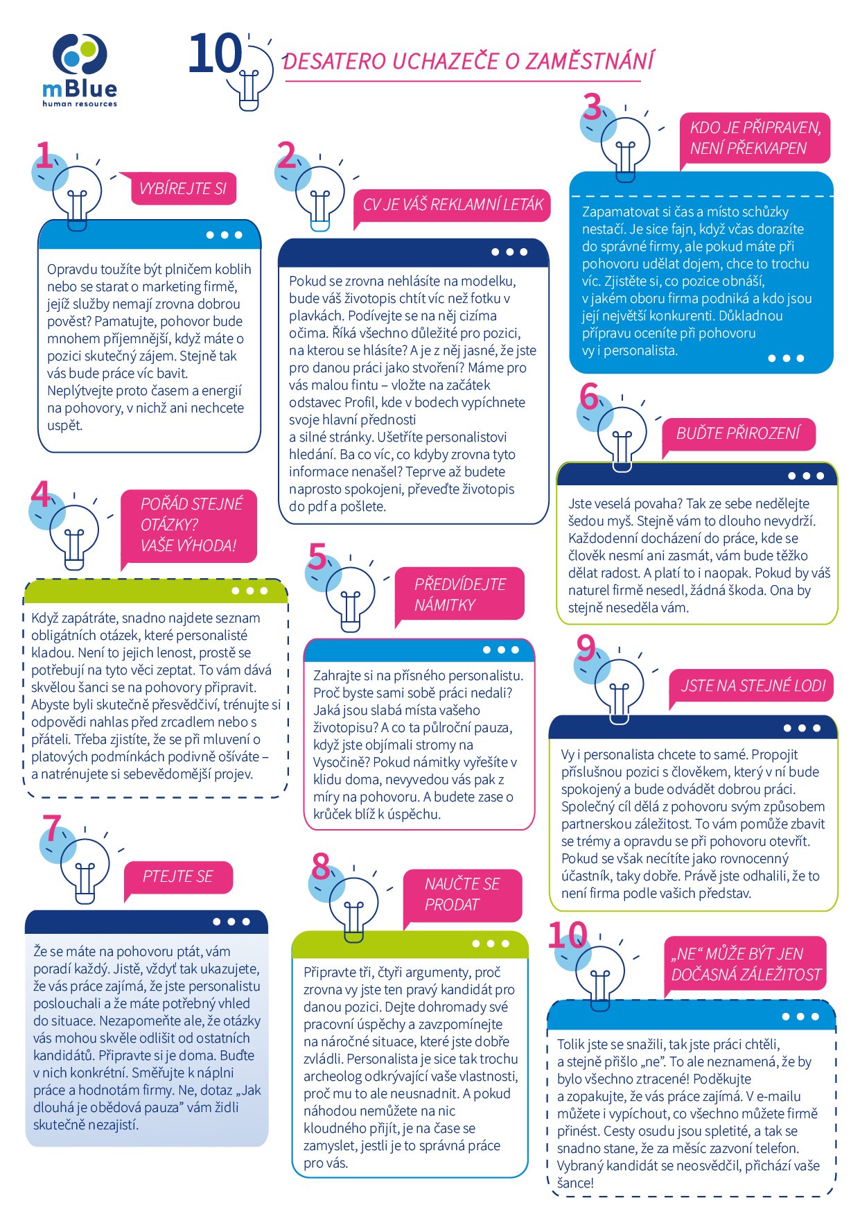 V souvislosti s 10letým výročím mBlue jsme pro všechny, kteří si pohrávají s myšlenkou změny zaměstnání, připravili kandidátské desatero. Deset rad od našich zkušených HR partnerů, jak proplout výběrovým řízením s lehkostí a kývnout na pracovní příležitost, která vás bude naplňovat a bavit.